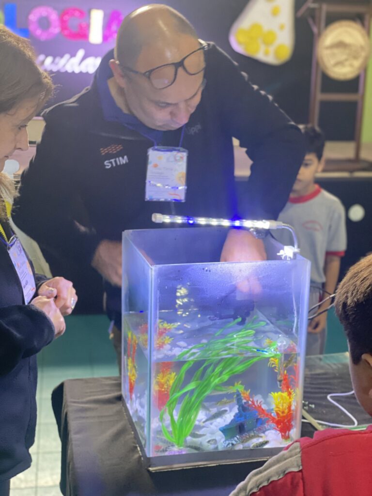 Como parte de su participación, STIM Chile instaló un acuario con salmones vivos, donde los alumnos pudieron observar aspectos clave relacionados con comportamiento, salud y bienestar animal. Junto con ello, el equipo técnico ofreció estaciones de microscopía, demostraciones prácticas y espacios de conversación que ayudaron a conectar conceptos aprendidos en clases con situaciones reales del sector productivo.